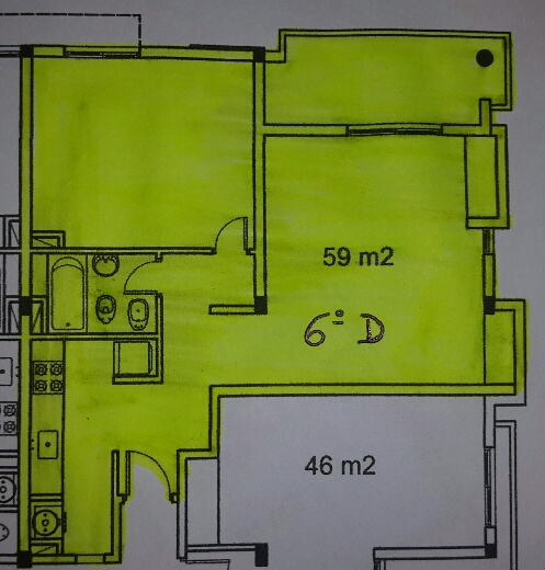 El departamento cuenta con 59.00 metros cuadrados de superficie total, distribuidos en 2 ambientes con 1 dormitorio y 1 baño.
