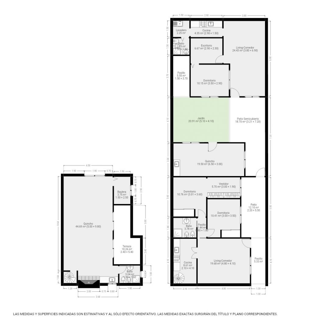 Vivienda 2: Al ingreso, Patio semicubierto + Jardín y Quincho cubierto (con Parrilla). Luego, posee Living-Comedor, 1 Dormitorio + Escritorio, Cocina, Lavadero y Baño.