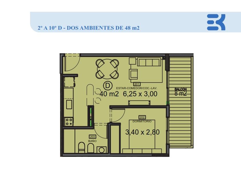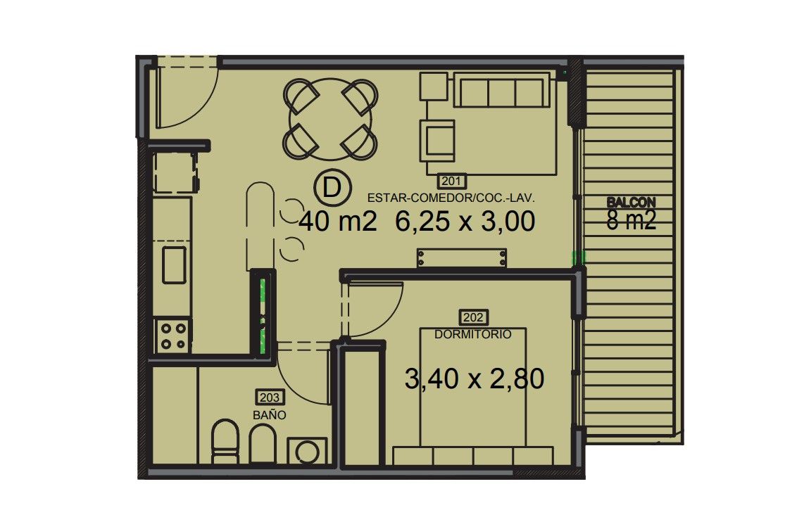 Superficie total: 48m2.- Cubiertos: 40m2.- Balcon: 8m2.- Agua caliente central. Artefactos de cocina a gas natural con campana de extraccion. Mesada tipo Silestone y Griferias tipo FV. Carpinterias de alta calidad con Doble vidrio Hermeticos.